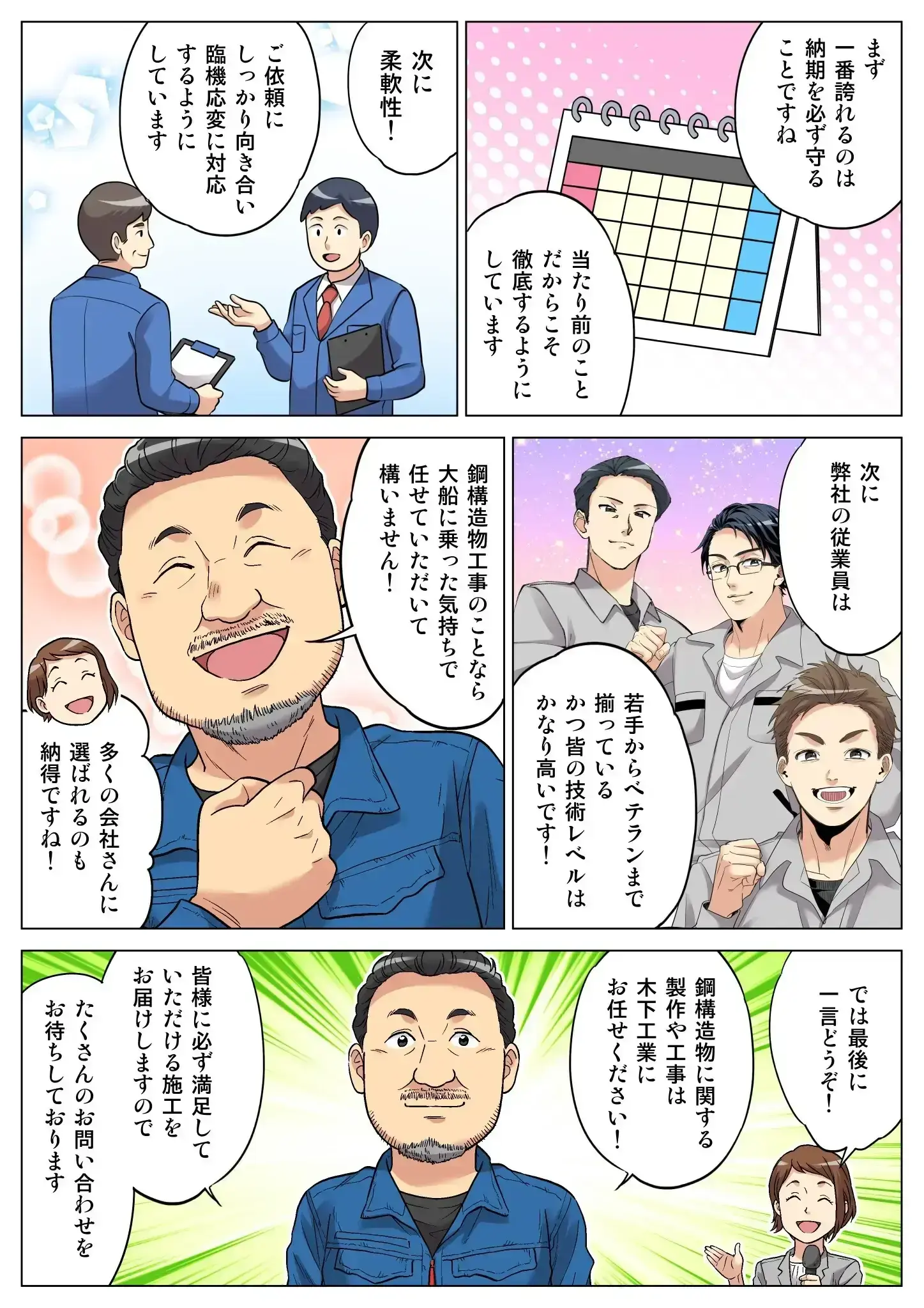 私たちは鋼構造物製作と工事の専門家です。お客様のニーズに合わせてカスタマイズされた製作と工事を提供いたします。そして専門知識と経験をもとに、最適なソリューションをご提案いたします。どうぞお気軽にお問い合わせください。